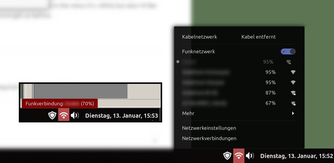 1. Hmm, I’m still running the “old” Cinnamon on Arch, and just double-checked: The icon shows one grey bar, mouse-over shows 67%. When I open the menu, the signal strength is shown at 100%. Seems to be an older bug.